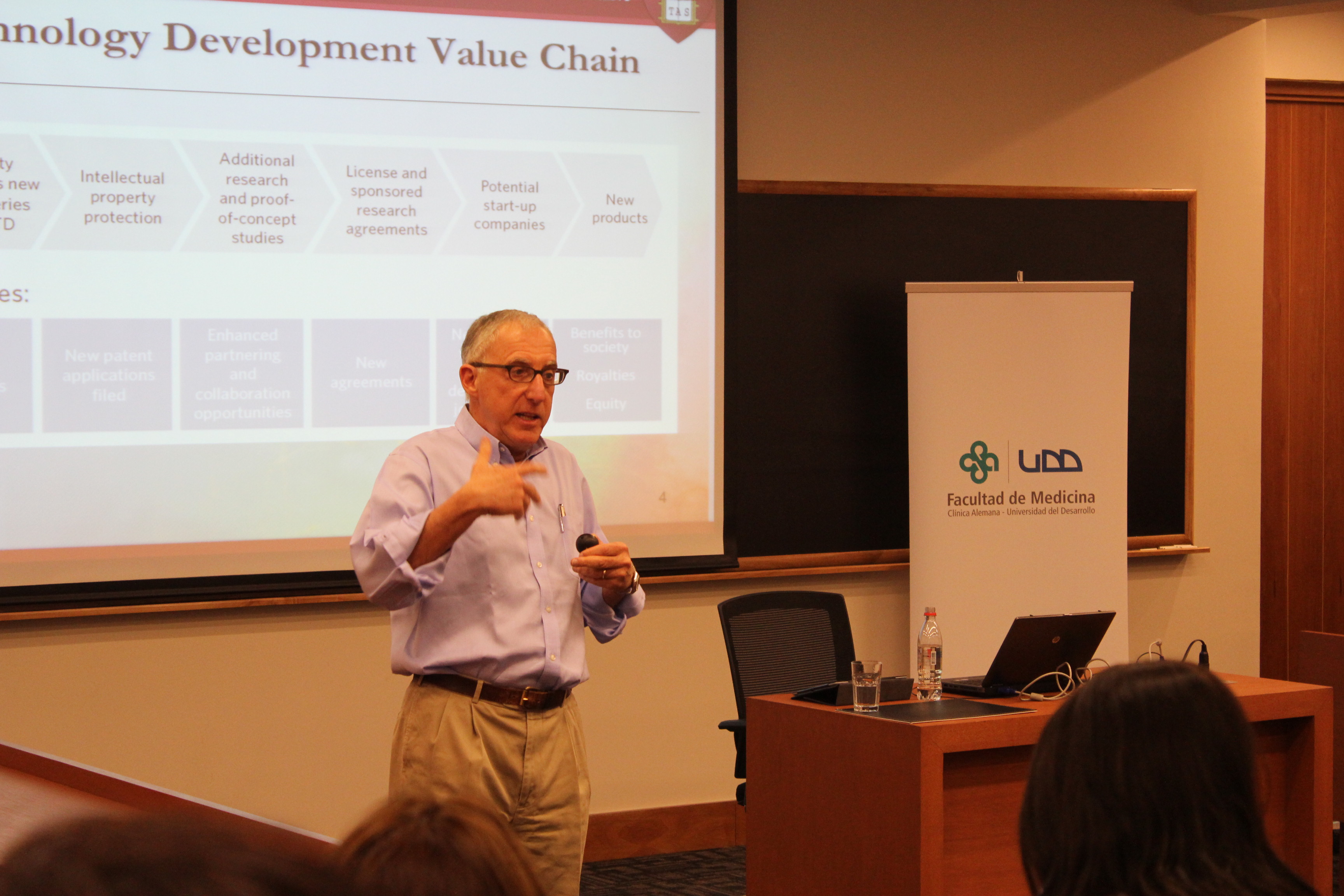 Kohlberg es miembro del Consejo Asesor de la Facultad de Medicina Clínica Alemana Universidad del Desarrollo. Su presentación se centró en cómo hacer que la investigación científico-tecnológica de las universidades se transformen en un producto o servicio que beneficie a la comunidad, al mismo tiempo que rinda frutos para la casa de estudios.