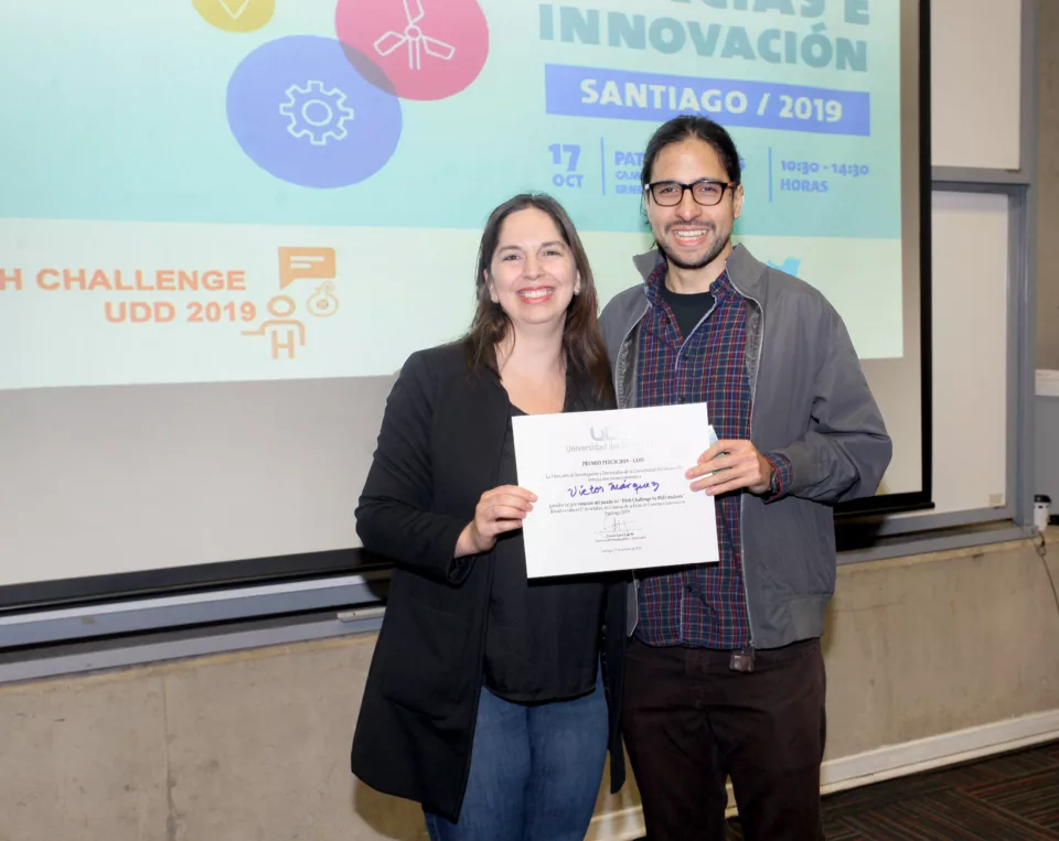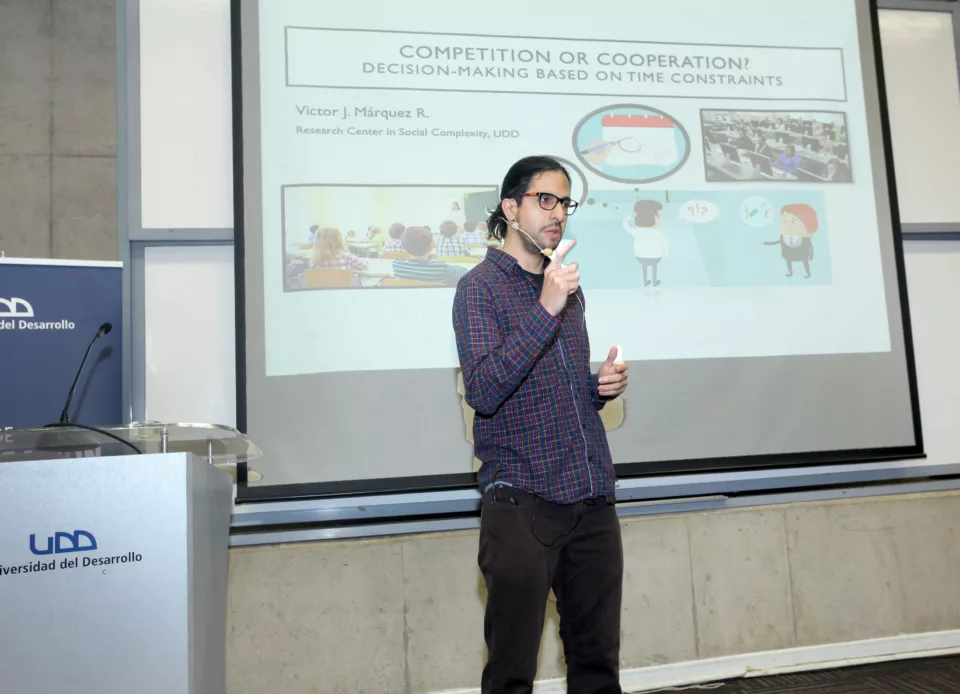 Por otra parte, el público asistente también tuvo la oportunidad de elegir a un ganador, el cual coincidió con la preferencia del jurado, destacando como mejor presentación a la del alumno Víctor Márquez del Doctorado en Investigación de la Complejidad Social (DCIM) con su investigación titulada “Competition or cooperation? Decision-making based on time constraints”.