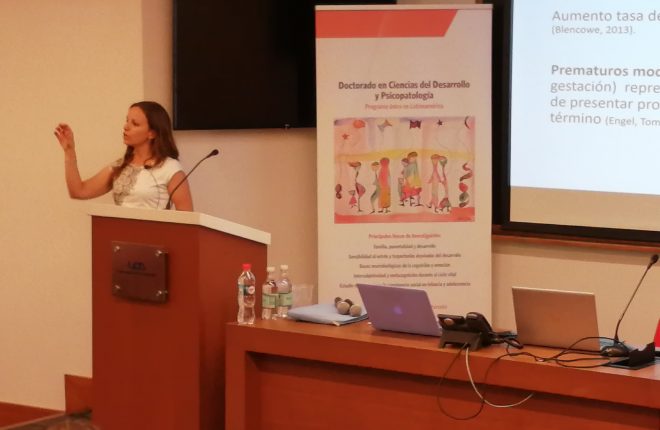 Al día siguiente se realizó una actividad abierta a todo el público interesado en la temática, que tuvo como tema principal la sensibilidad y regulación en las interacciones diádicas, donde las alumnas del DCDP, Andrea Mira y Fernanda Prieto expusieron sobre las trayectorias del desarrollo de infantes de pretérmino moderado y el impacto de las relaciones transaccionales entre la madre y su hijo/a; y sobre La coregulación diádica en la auto- regulación infantil, respectivamente.