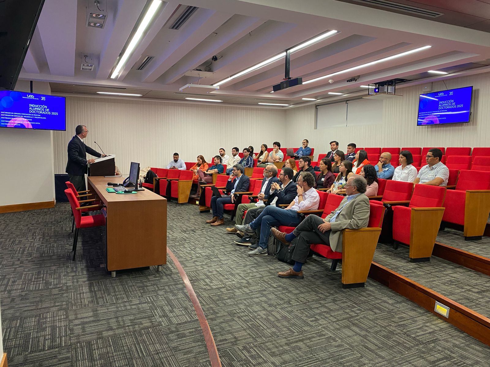 Los alumnos del primer año de doctorado fueron recibidos por el Vicerrector (I)de Investigación y Doctorados, Ernesto Silva, quien enfatizó en el compromiso de la institución con la investigación, entregando financiamiento y apoyo a todos los programas de doctorado enfocados en la internacionalización y la investigación innovadora y que entregue soluciones al entorno social o socioproductivo.