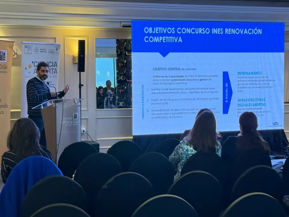 En este contexto, Víctor Martínez, director de Investigación y del proyecto en la universidad, presentó la nueva etapa del proyecto, titulada “Hacia una Ciencia Abierta sostenible: transformación tecnológica, gobernanza y cultura UDD”, en el marco de la adjudicación en primer lugar del concurso InES Ciencia Abierta Renovación Competitiva 2025.